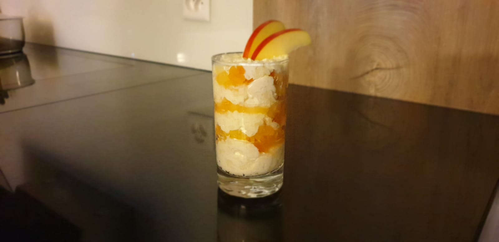 Die Süssmostcreme abwechselnd mit dem Gedämpften Apfel in ein Glas füllen.